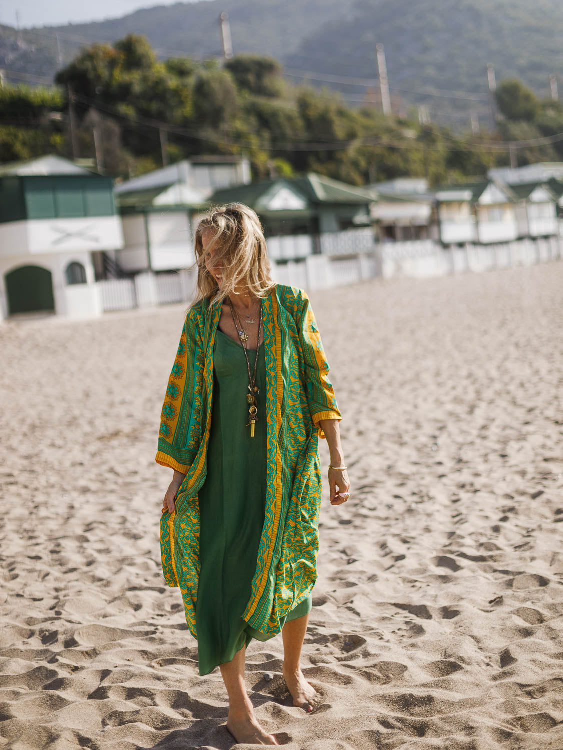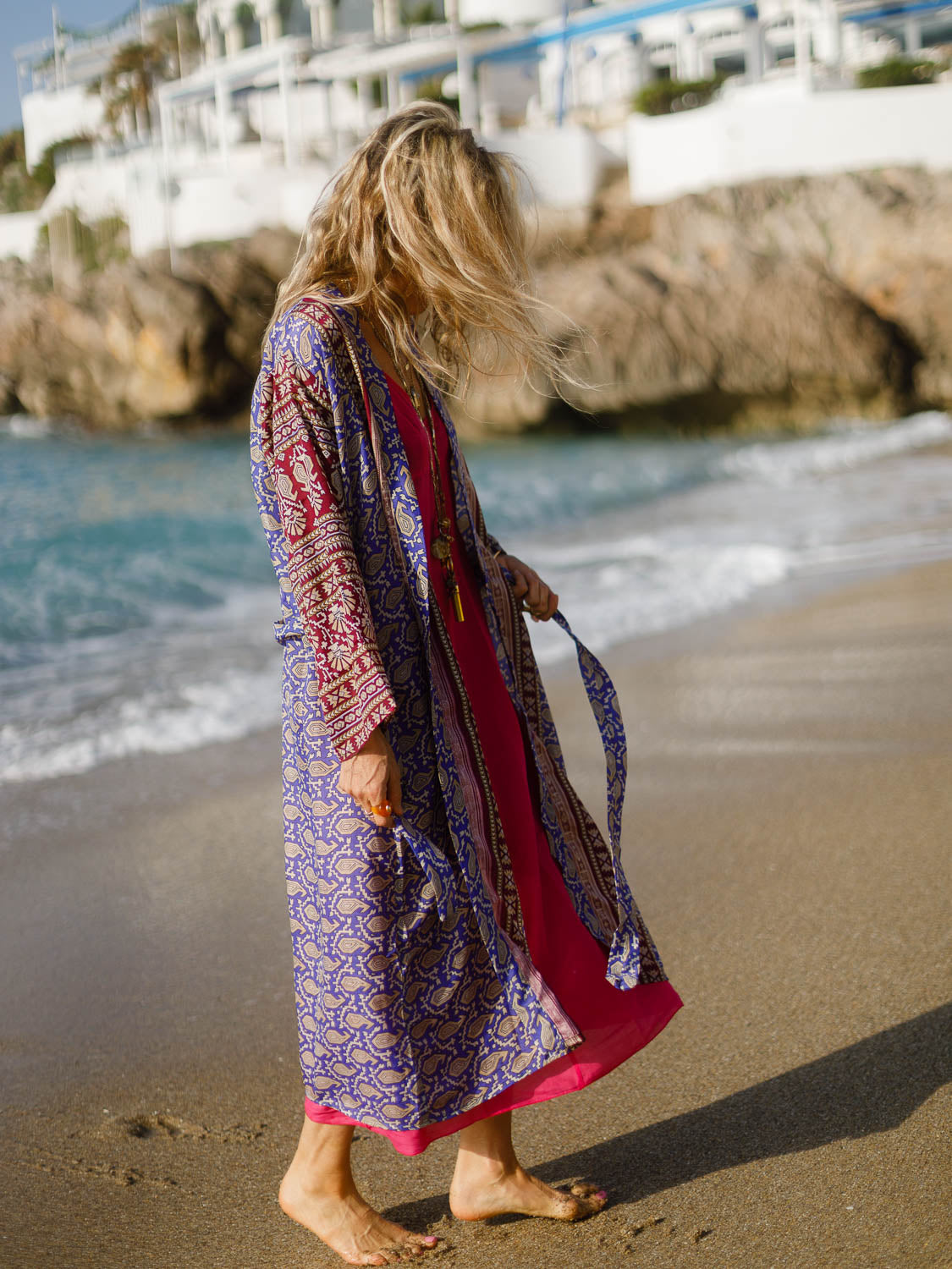 Made from georgette fabric with poly silk thread embroidery, this kimono is cut in a flowy, relaxed shape emphasised by the wide sleeves. Wear it as a coverup over a bikini or top and secure it closed with the optional waist belt.