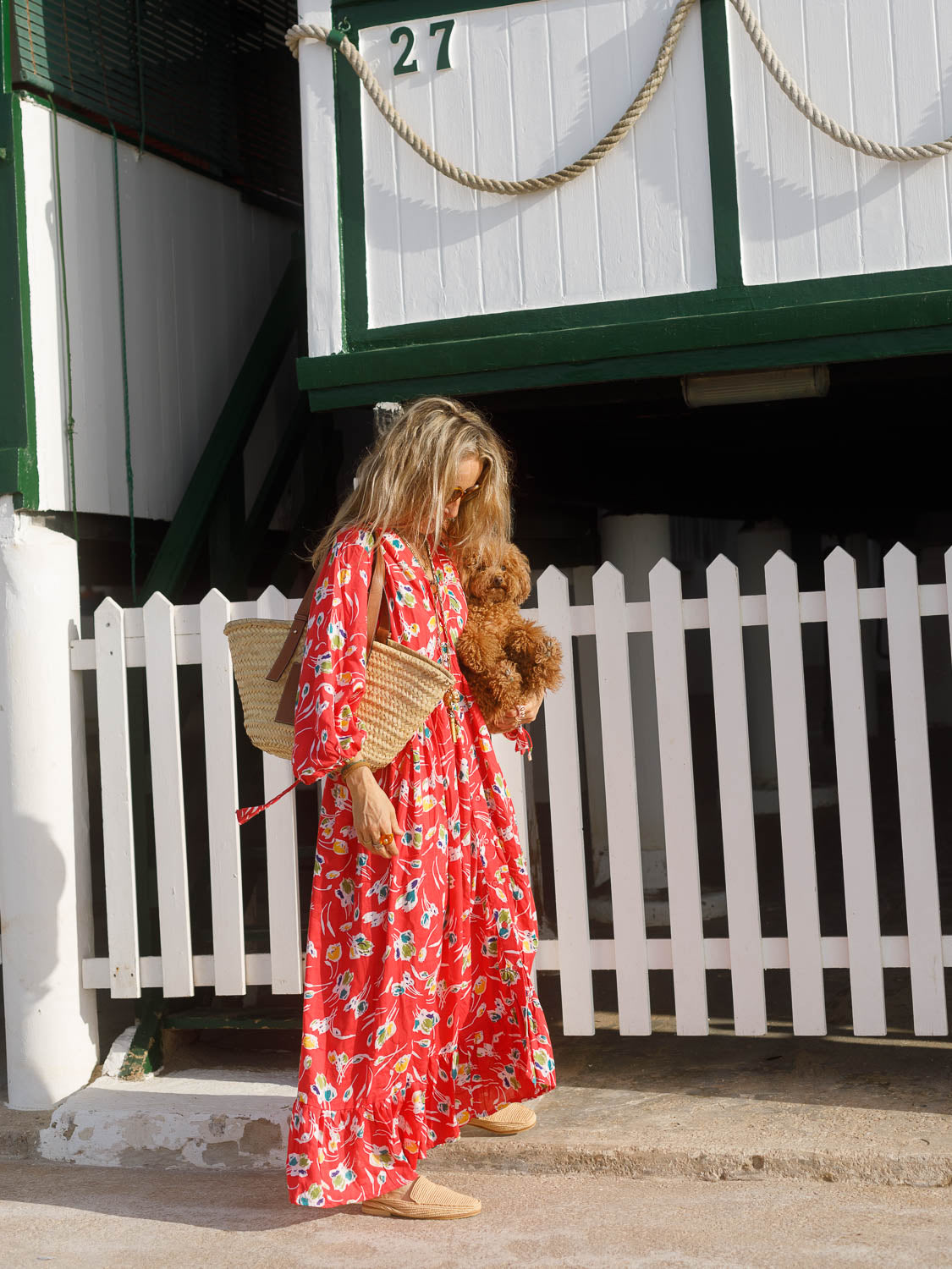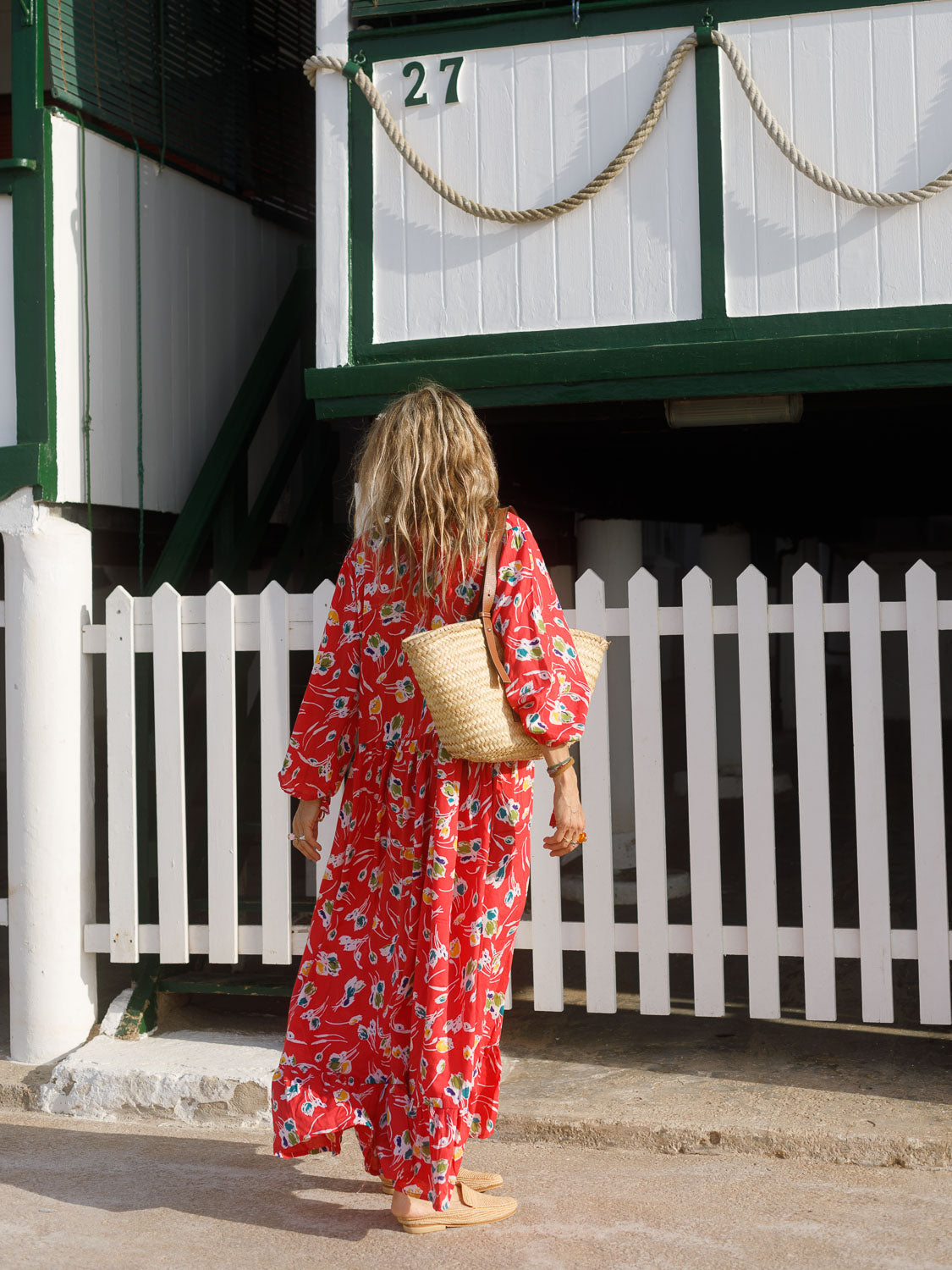 Impresionante vestido con botones en una rica combinación de colores tierra/bayas y motivos florales.