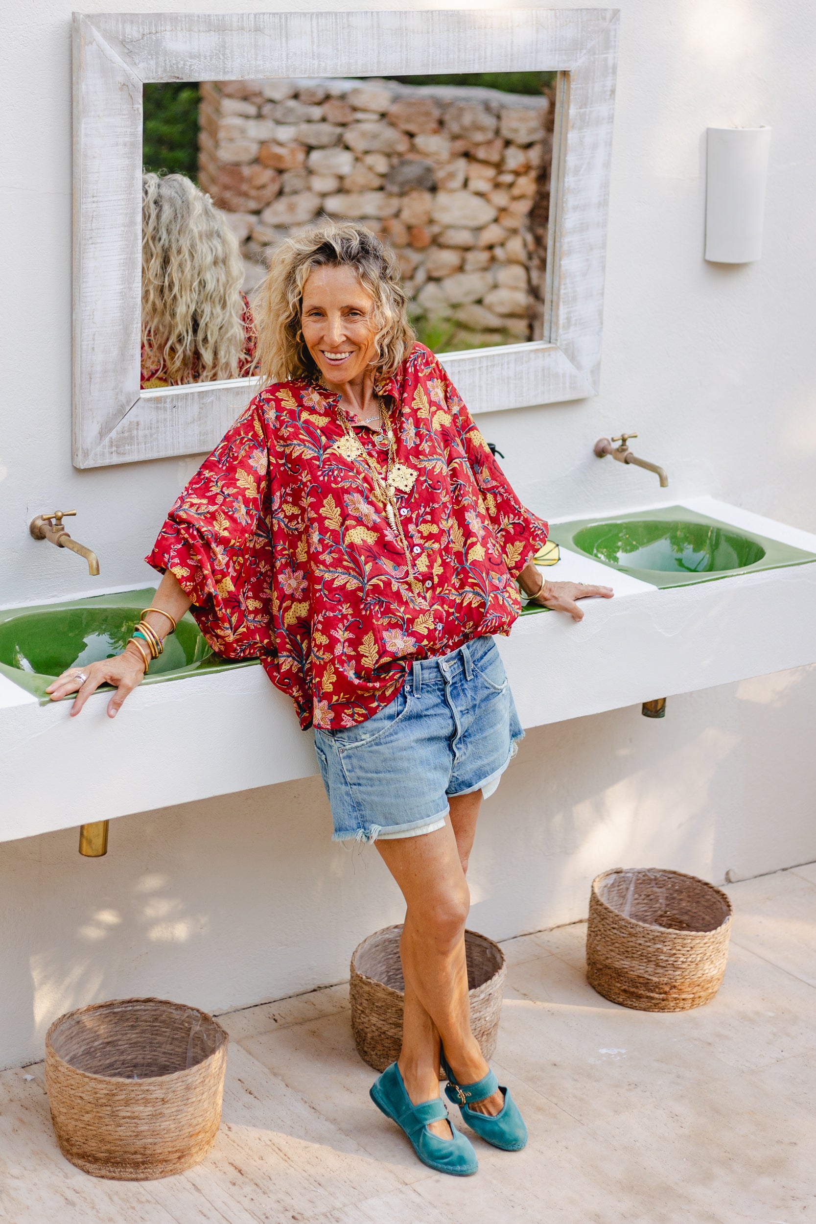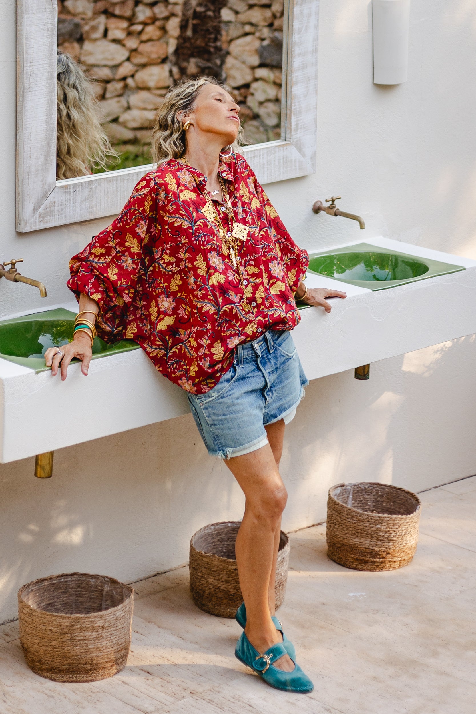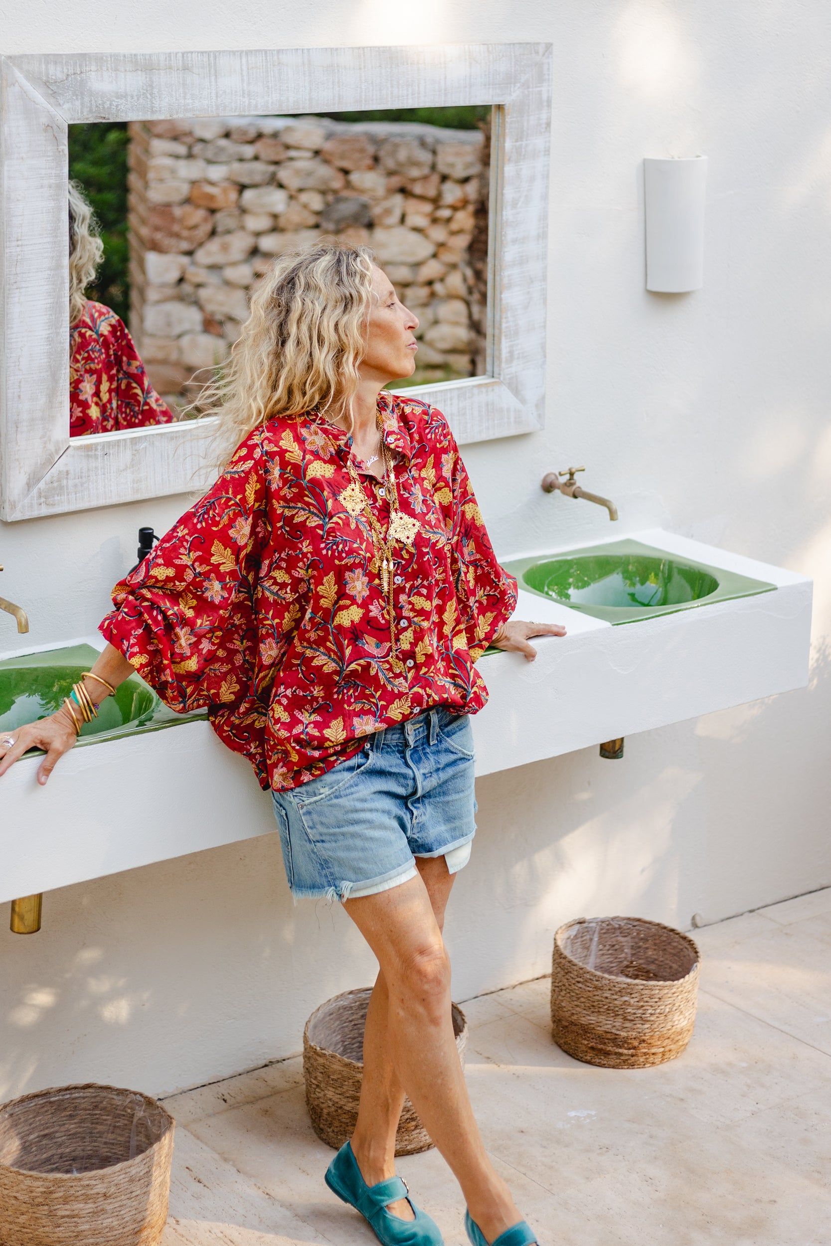 A fresh, summery piece designed to elevate both your city looks and beachside outfits. Crafted from floral cotton, this blouse features wide, airy sleeves, delicate buttons, and soft elastic cuffs for effortless comfort.