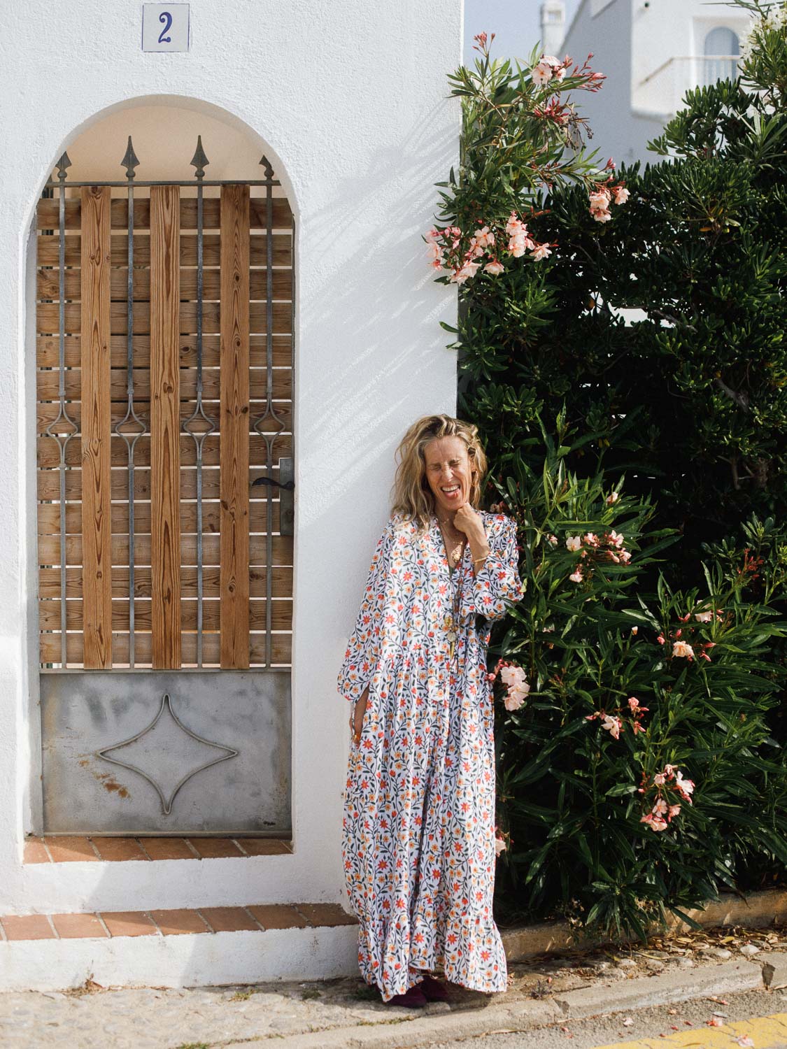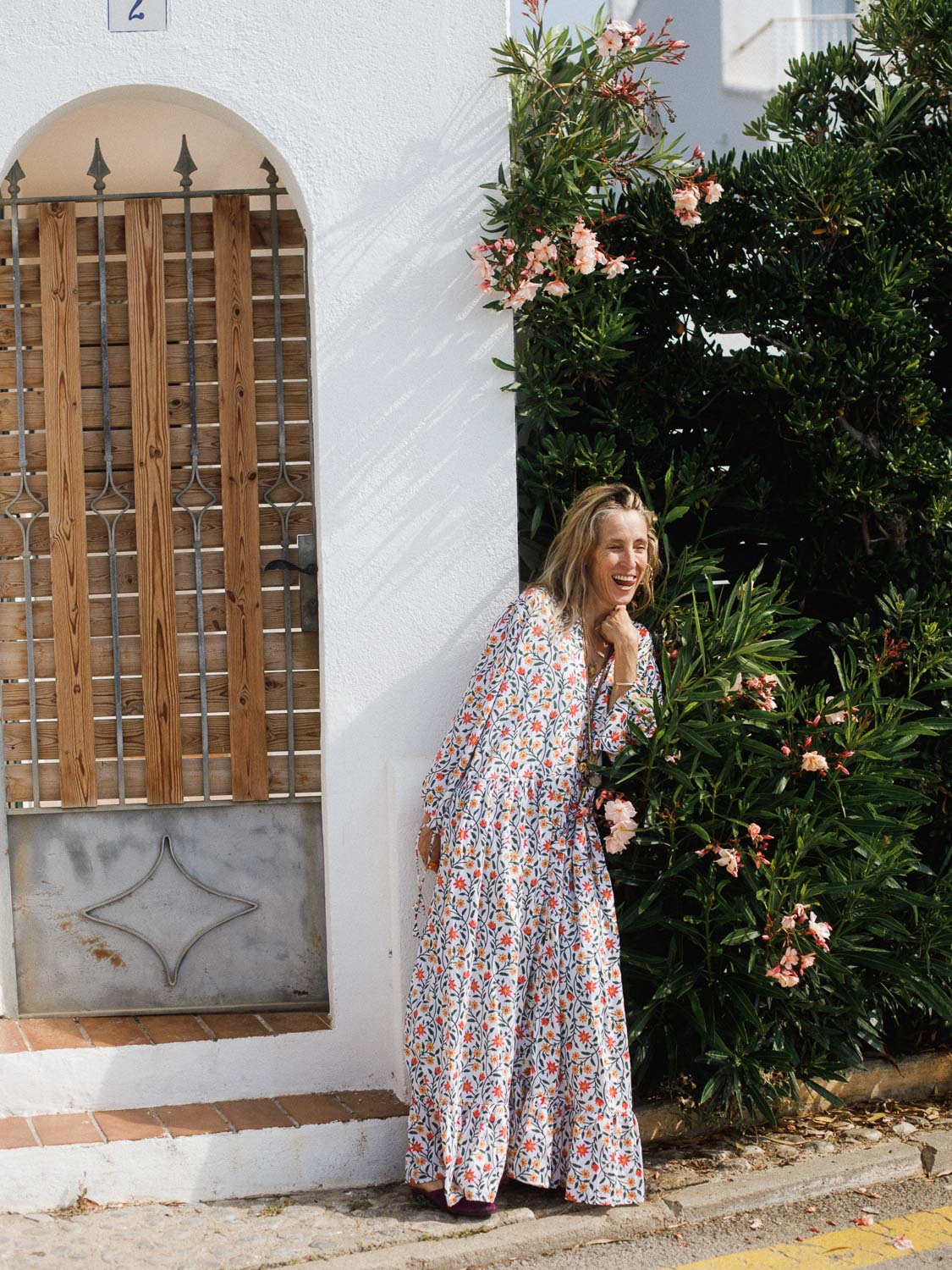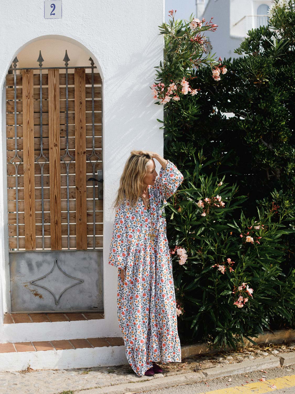 Impresionante vestido con botones en una rica combinación de colores tierra/bayas y motivos florales.